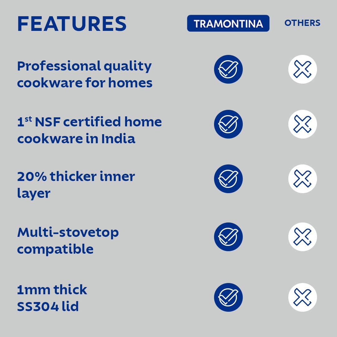 The circular bottom enables easy tossing and stirring of your veggies, a process that aids in monitoring the texture of the food. The lid on the kadai retains and enhances the flavour. Our stainless steel kadai ensures equal distribution of heat and works as a secure base for frying and deep-frying. Embrace the art of cooking in the Tramontina stainless steel tri-ply kadai.