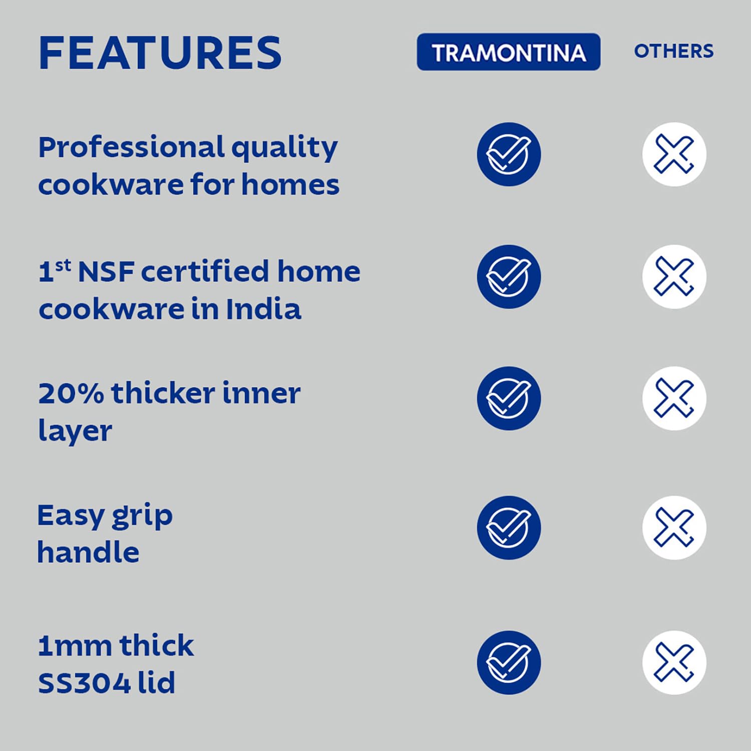 - NSF Certification: Tramontina Aeion debuts as an NSF Certified Home Usage cookware brand in India. Fitted with Stainless Steel Rivets facilitating antimicrobial properties, Tramontina Aeion Cookware Range assures worry-free cooking for years!