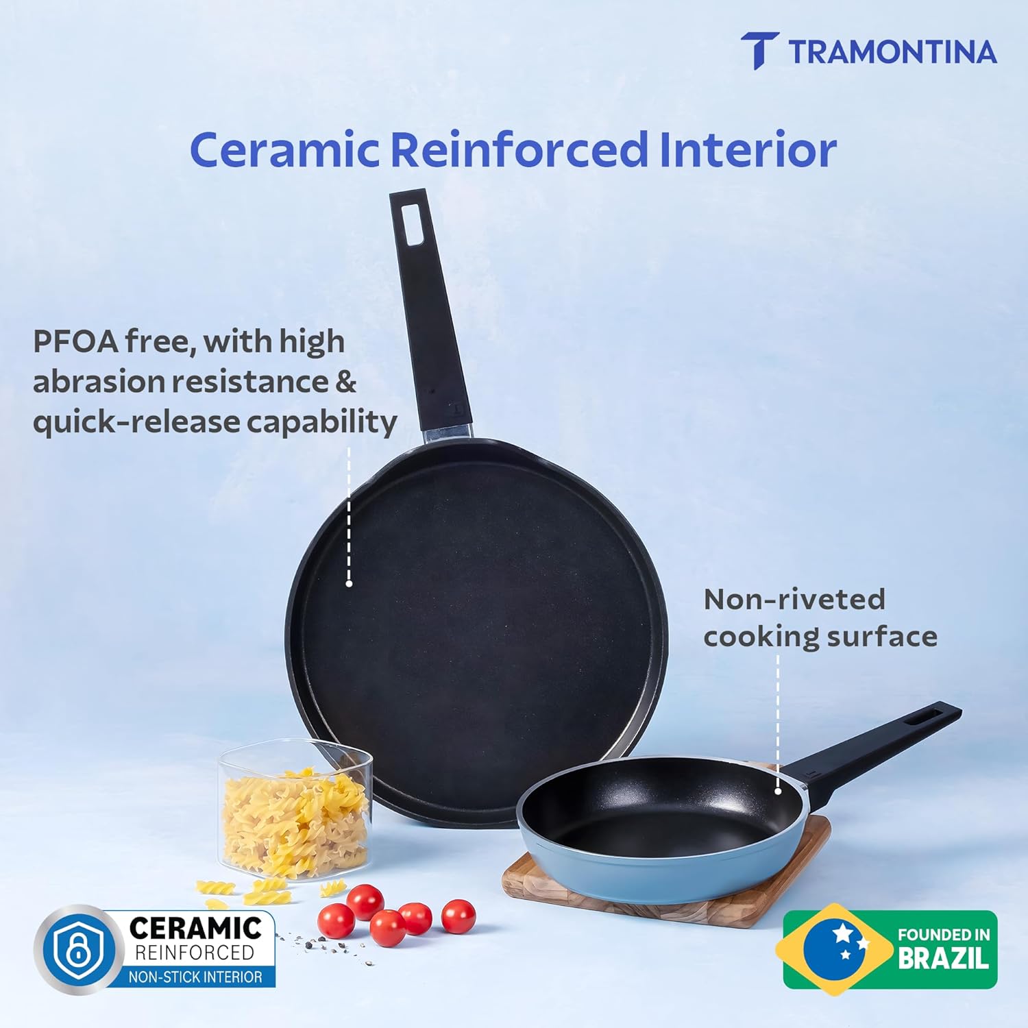 Tramontina Aura is a premium ceramic reinforced cookware range engineered for healthier, low-oil cooking. Built with cold-forged aluminium, the range delivers quick and even heat distribution for consistent results. The ceramic non-stick surface ensures smooth food release and easy cleaning, making it perfect for everyday Indian cooking styles like frying, sautéing, simmering, tadka and dosa preparation.