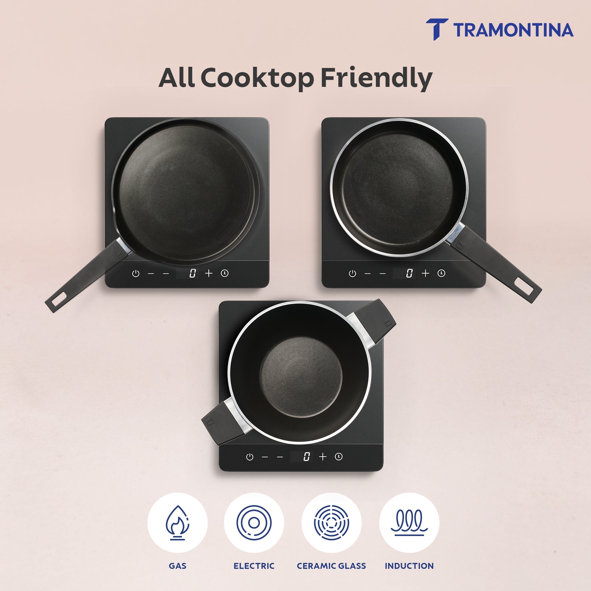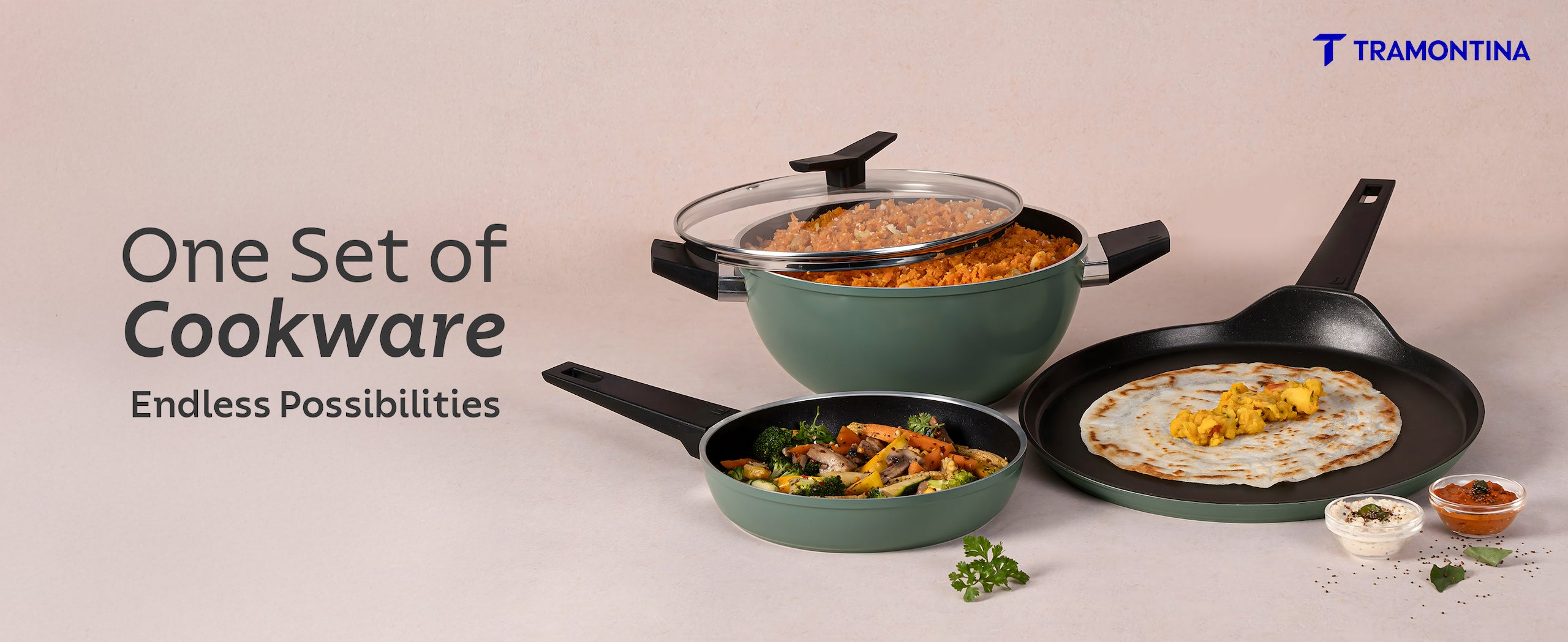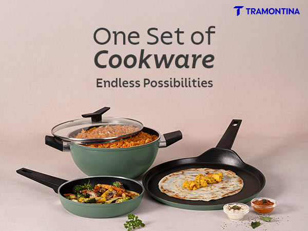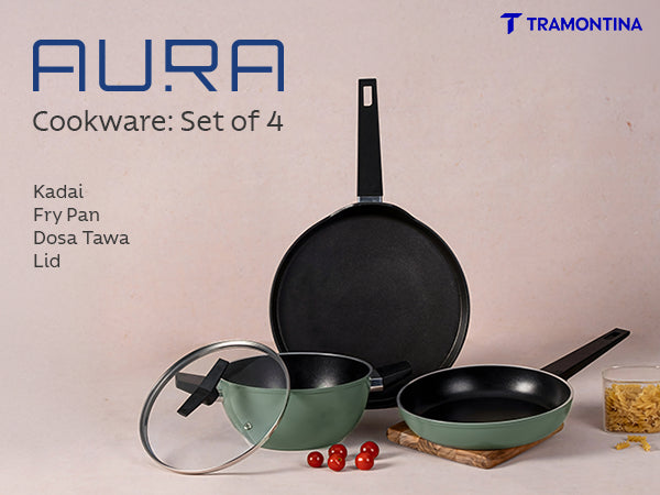 Tramontina Aura is a premium ceramic reinforced cookware range engineered for healthier, low-oil cooking. Built with cold-forged aluminium, the range delivers quick and even heat distribution for consistent results. The ceramic non-stick surface ensures smooth food release and easy cleaning, making it perfect for everyday Indian cooking styles like frying, sautéing, simmering, tadka and dosa preparation.
