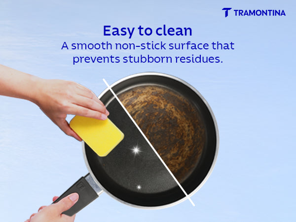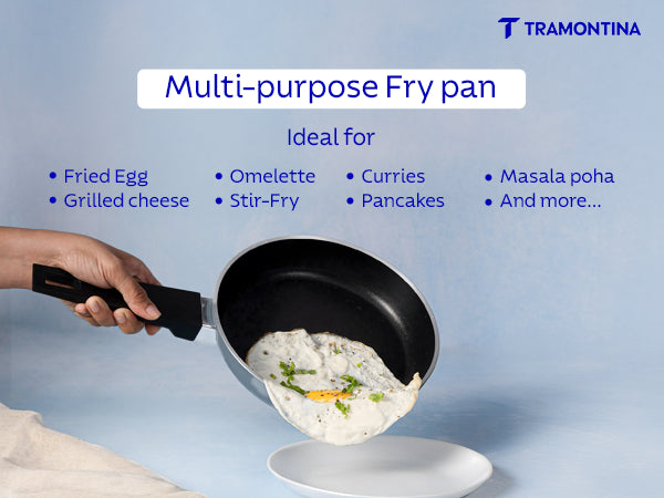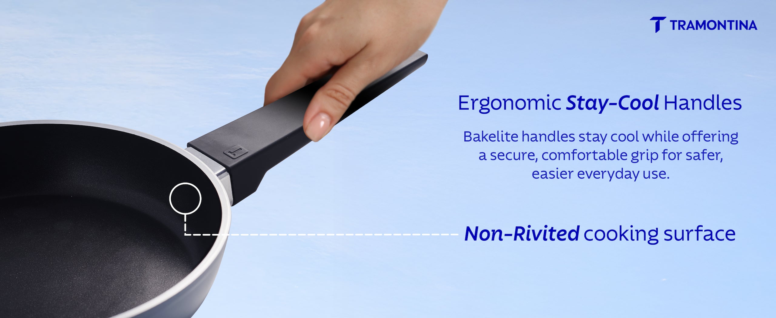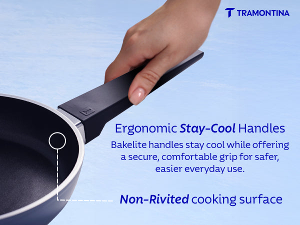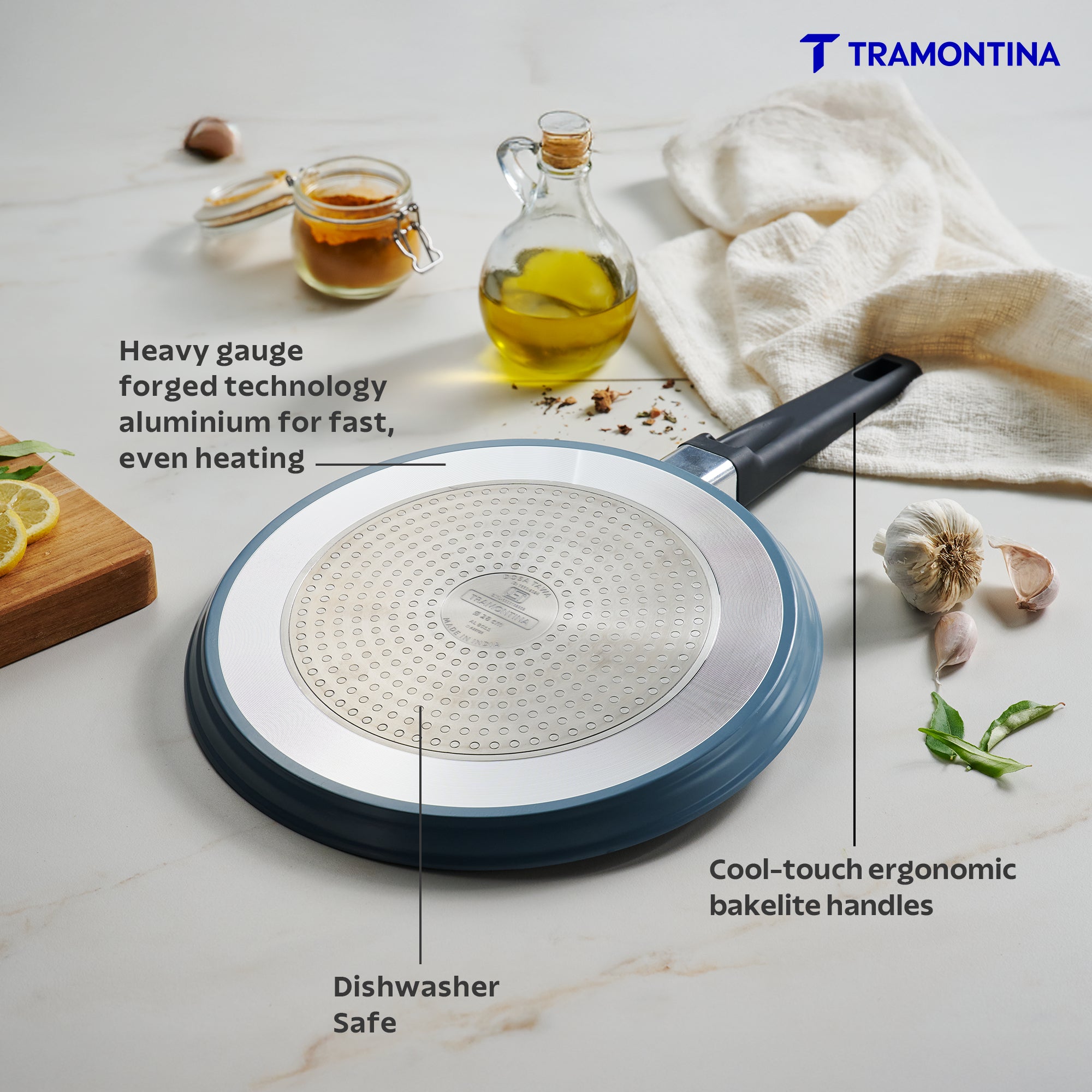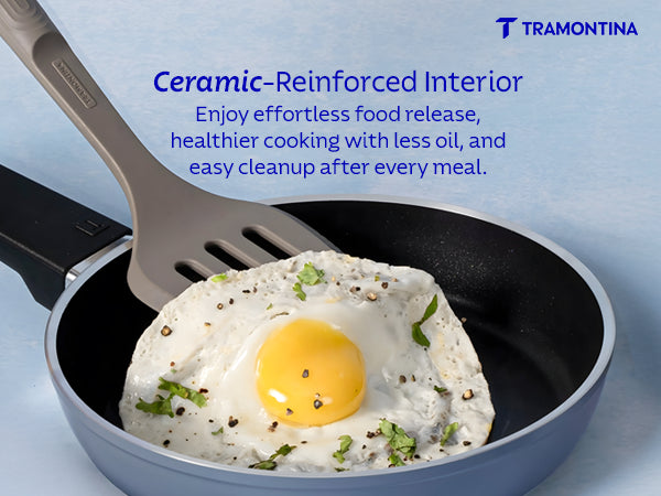Tramontina Aura is a premium ceramic reinforced cookware range engineered for healthier, low-oil cooking. Built with cold-forged aluminium, the range delivers quick and even heat distribution for consistent results. The ceramic non-stick surface ensures smooth food release and easy cleaning, making it perfect for everyday Indian cooking styles like frying, sautéing, simmering, tadka and dosa preparation.
