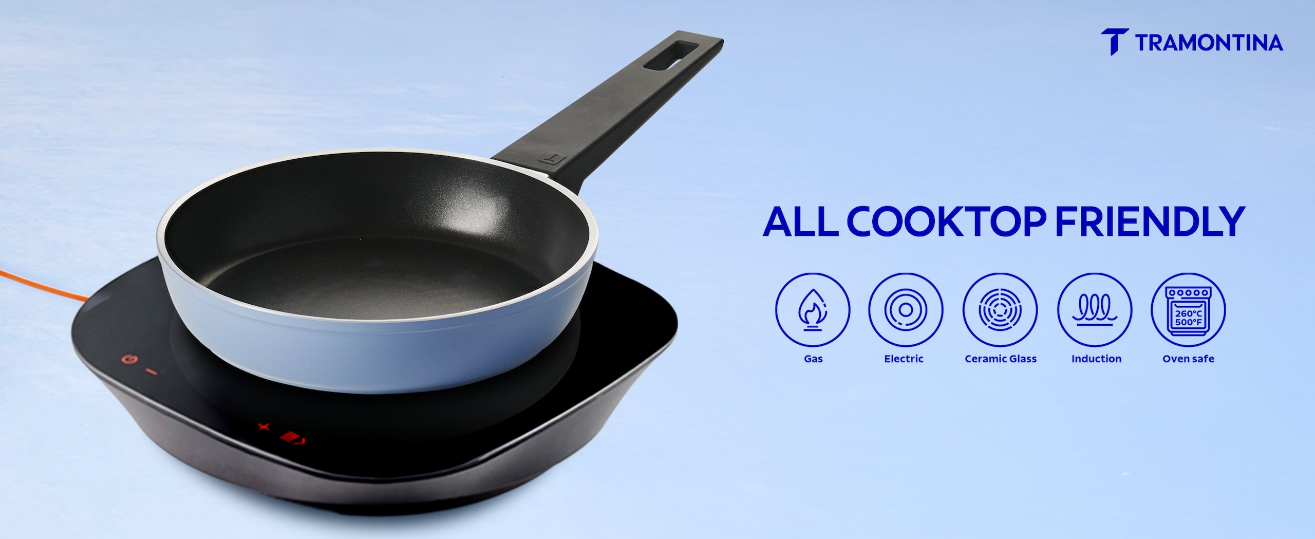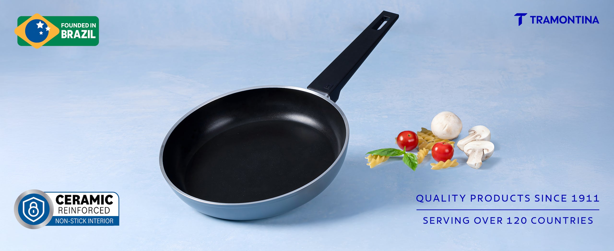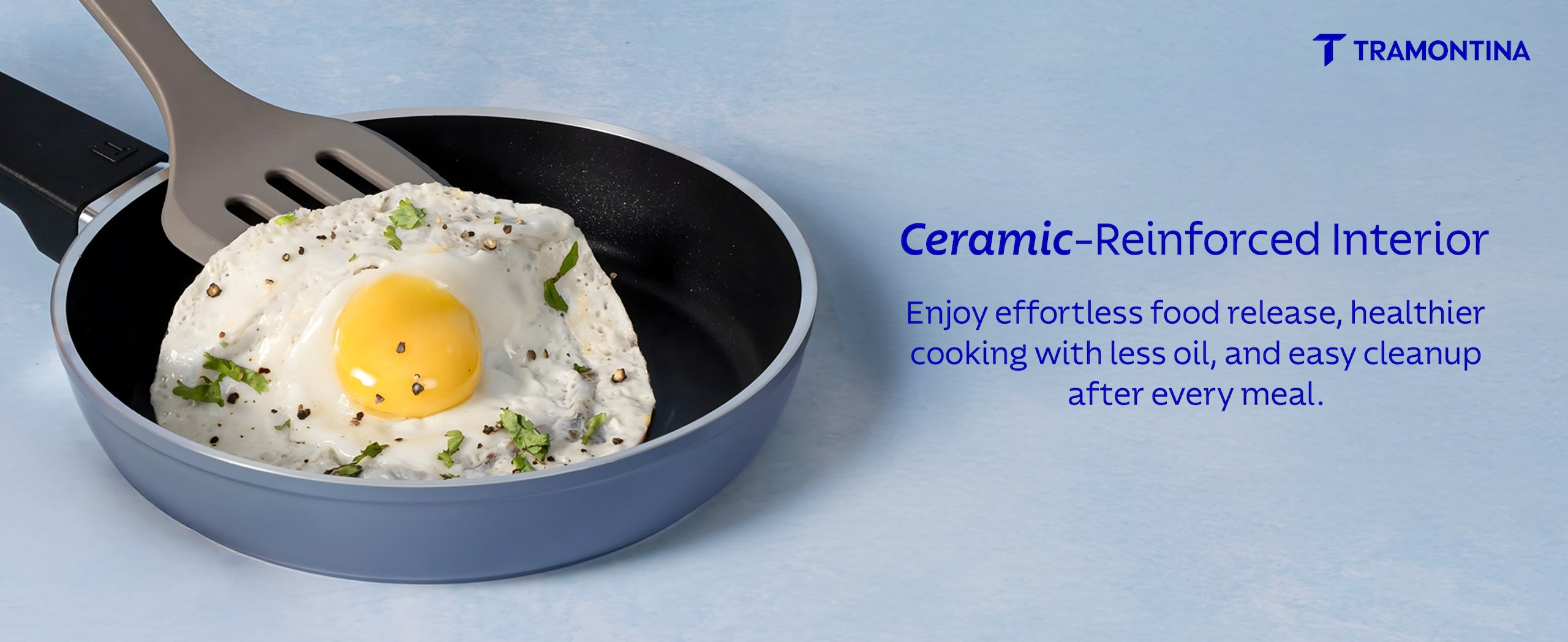 Tramontina Aura is a premium ceramic reinforced cookware range engineered for healthier, low-oil cooking. Built with cold-forged aluminium, the range delivers quick and even heat distribution for consistent results. The ceramic non-stick surface ensures smooth food release and easy cleaning, making it perfect for everyday Indian cooking styles like frying, sautéing, simmering, tadka and dosa preparation.