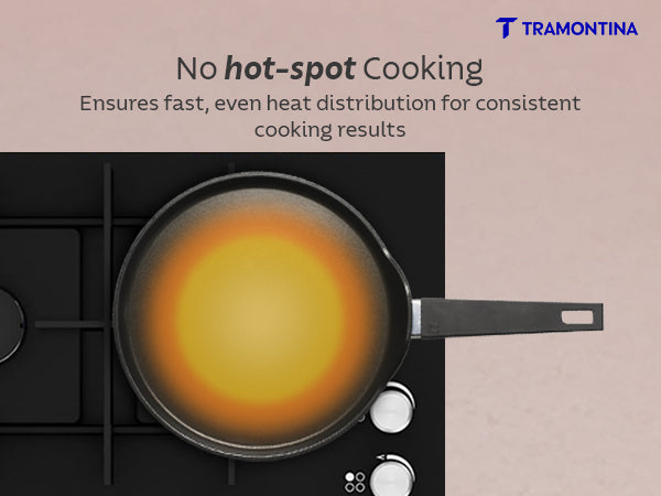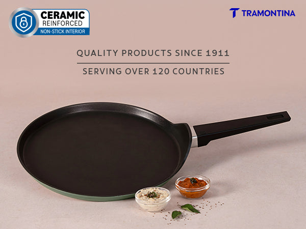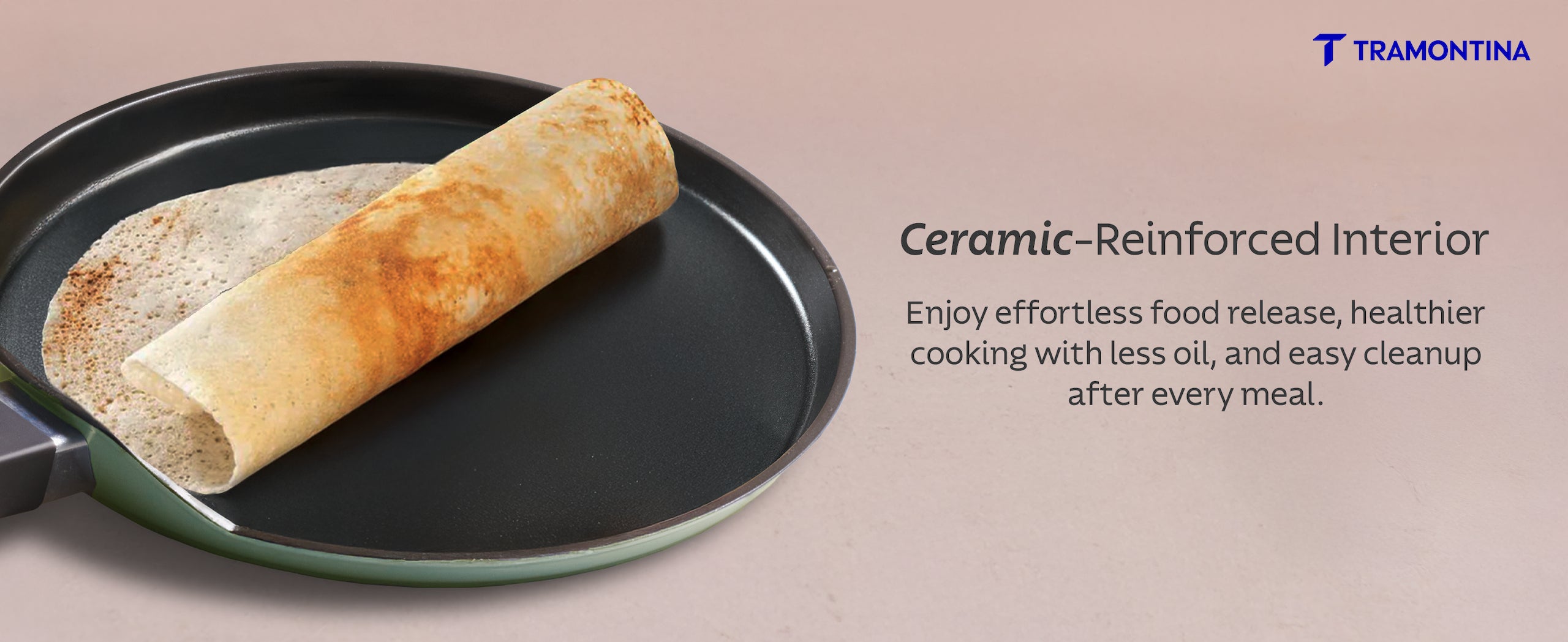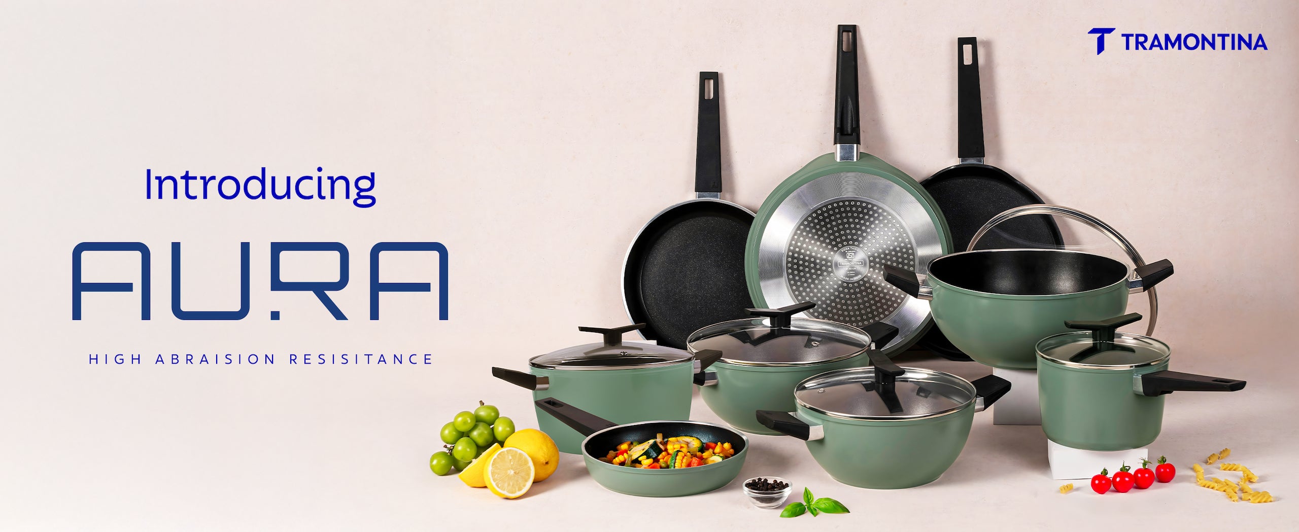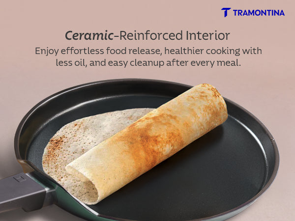 Tramontina Aura is a premium ceramic reinforced cookware range engineered for healthier, low-oil cooking. Built with cold-forged aluminium, the range delivers quick and even heat distribution for consistent results. The ceramic non-stick surface ensures smooth food release and easy cleaning, making it perfect for everyday Indian cooking styles like frying, sautéing, simmering, tadka and dosa preparation.