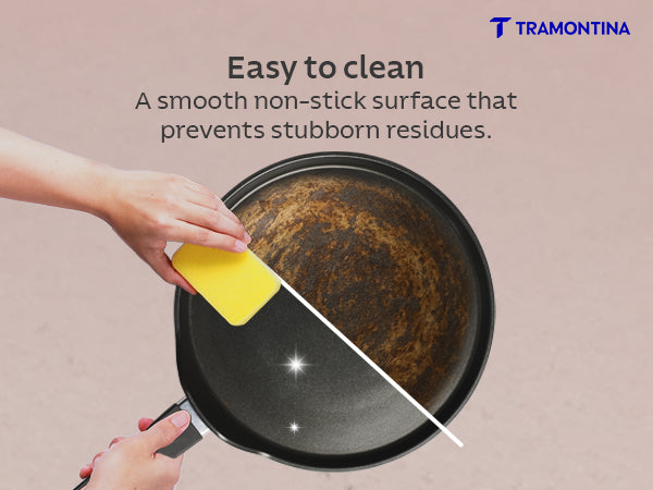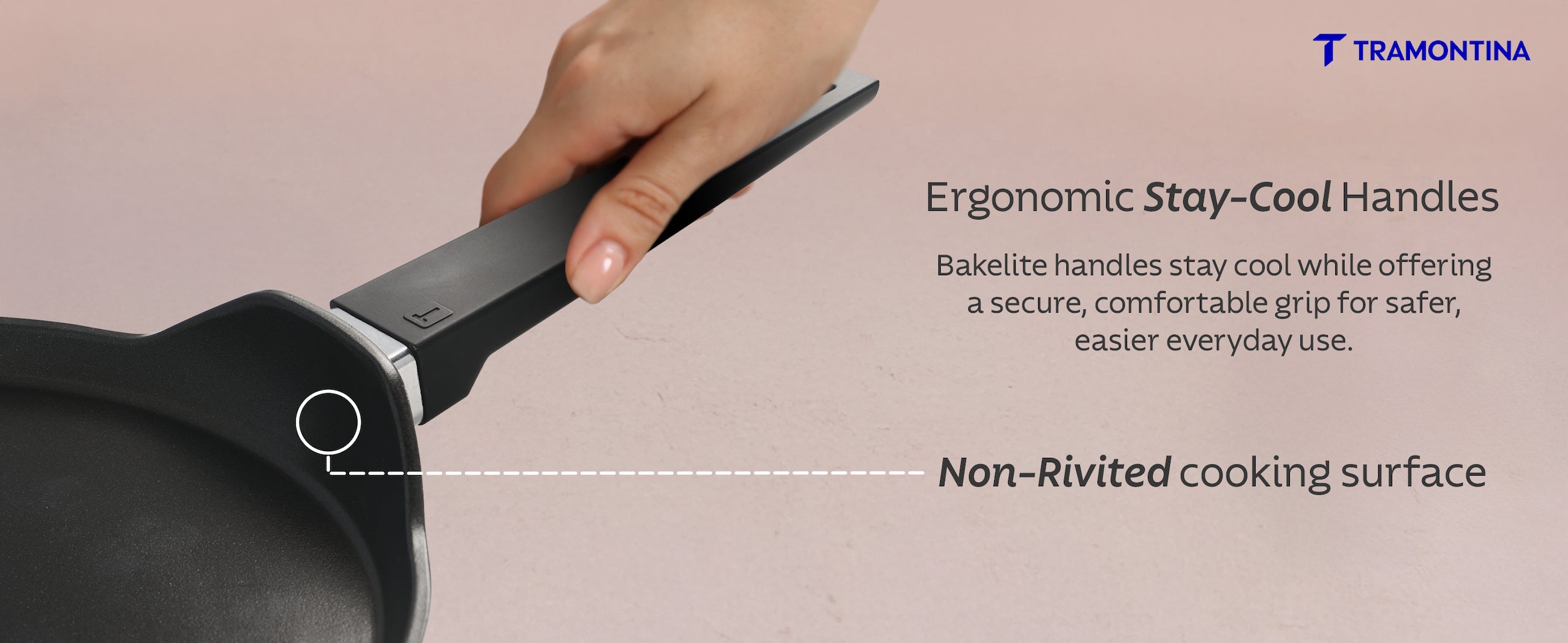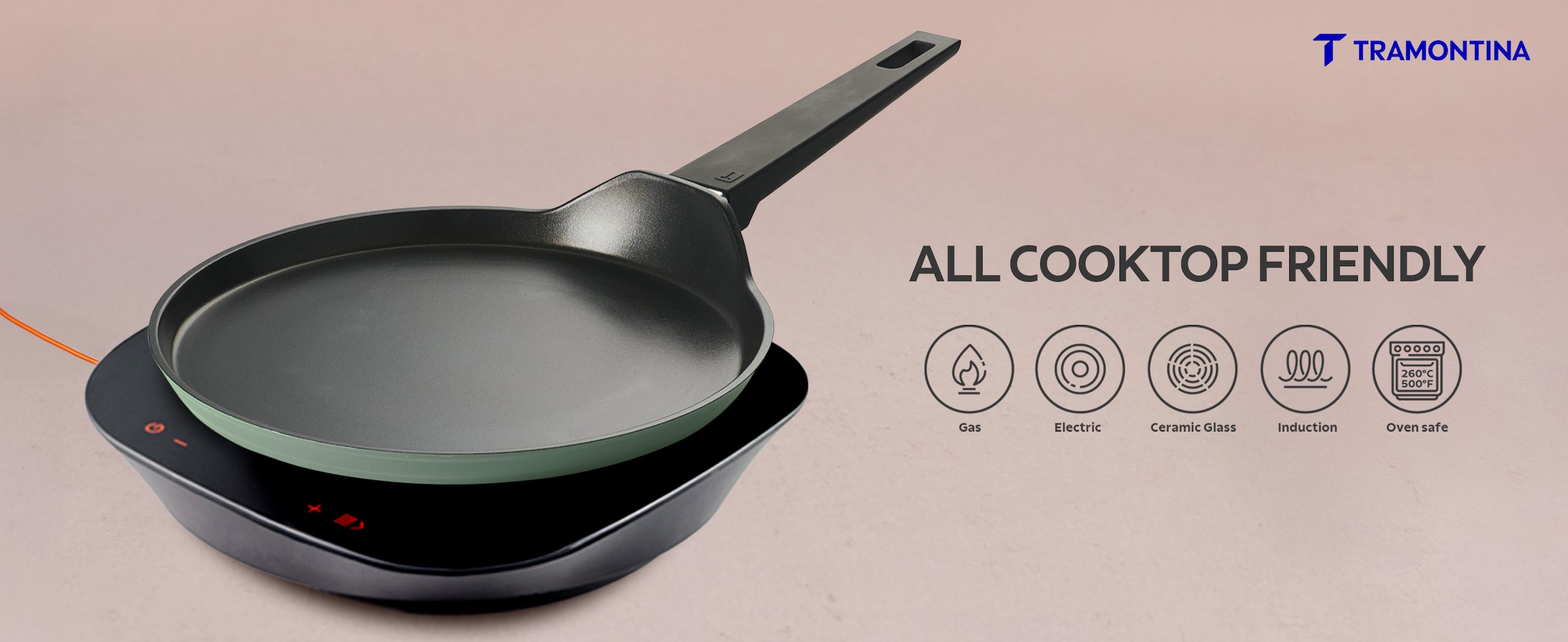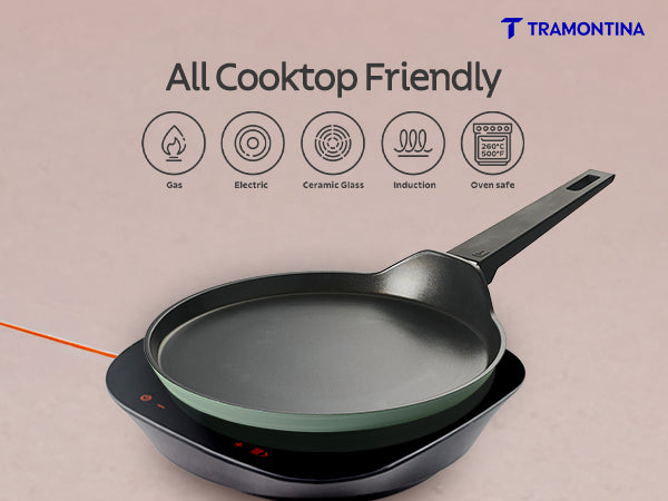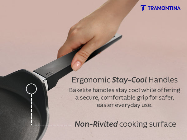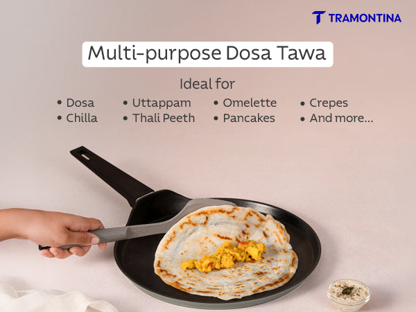Tramontina Aura is a premium ceramic reinforced cookware range engineered for healthier, low-oil cooking. Built with cold-forged aluminium, the range delivers quick and even heat distribution for consistent results. The ceramic non-stick surface ensures smooth food release and easy cleaning, making it perfect for everyday Indian cooking styles like frying, sautéing, simmering, tadka and dosa preparation.