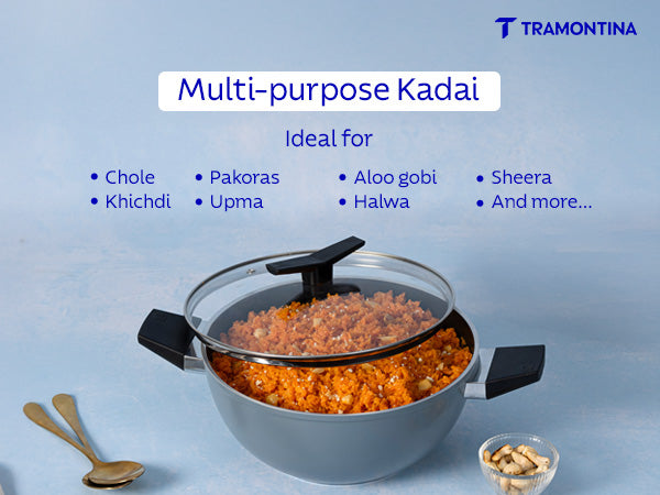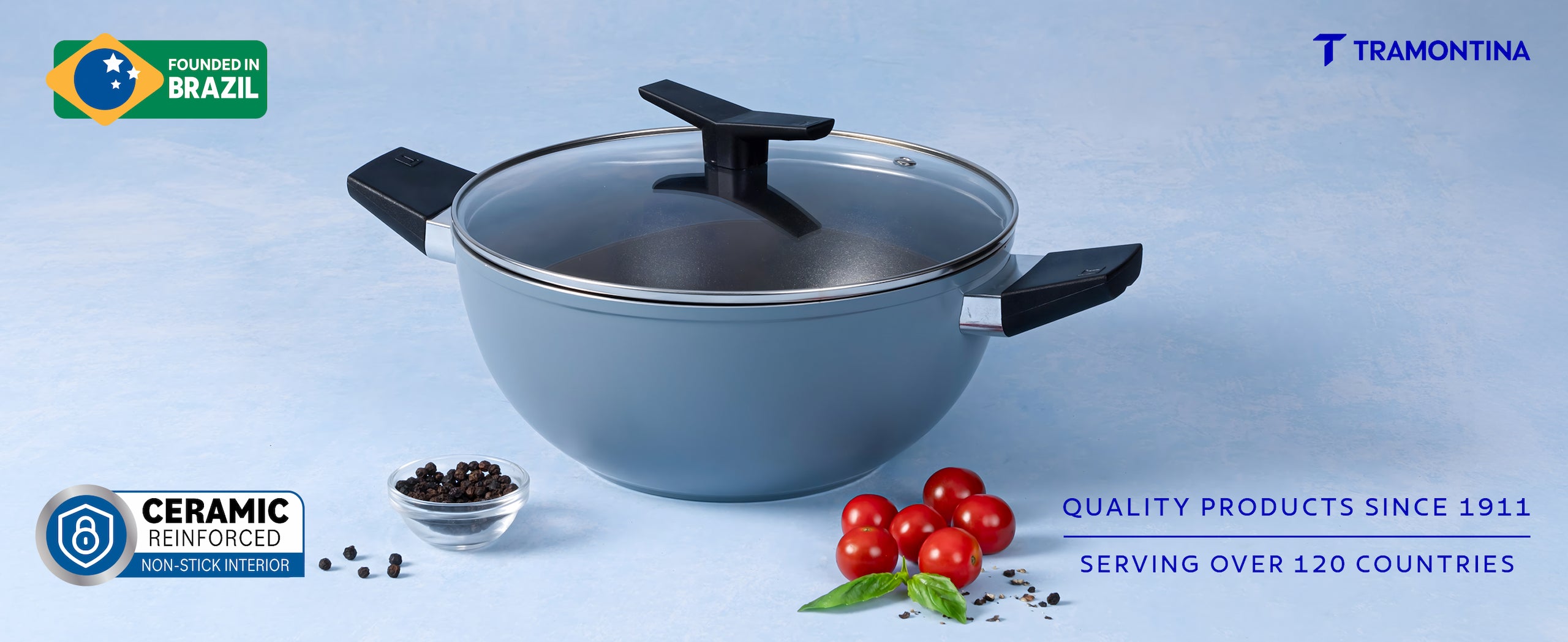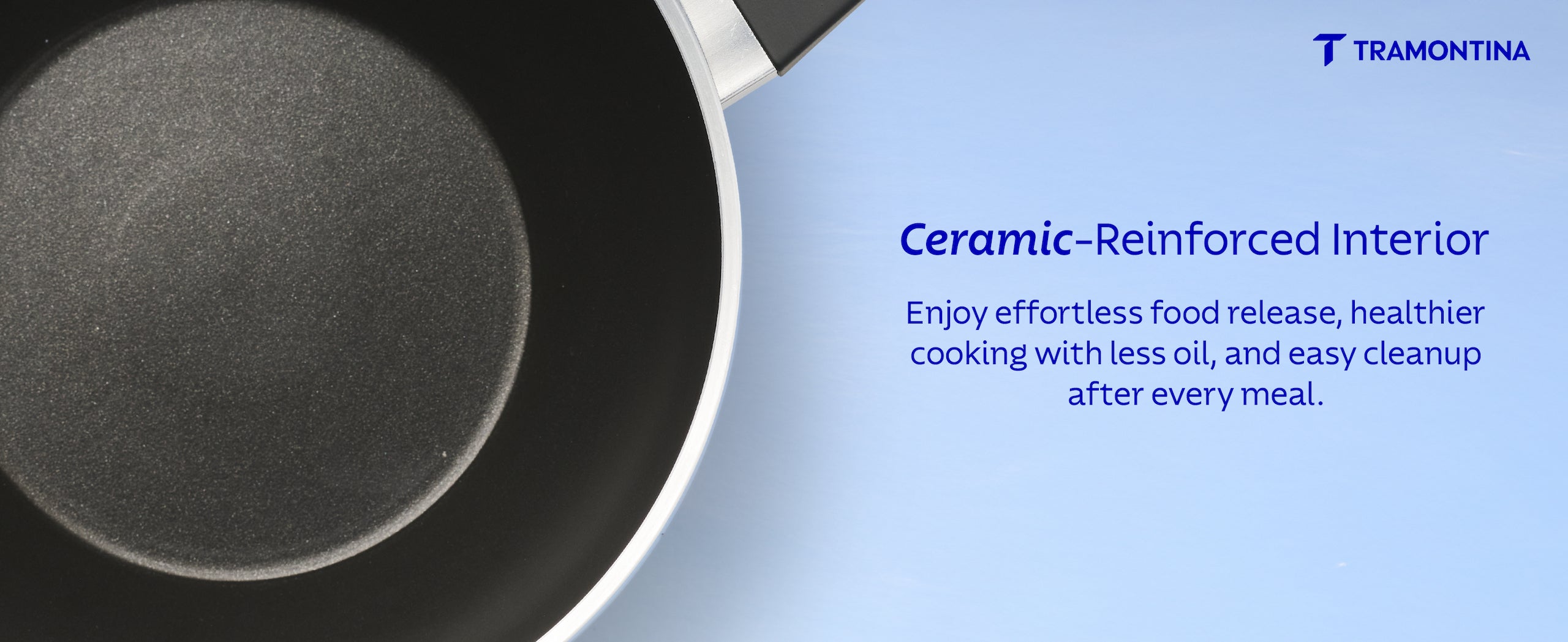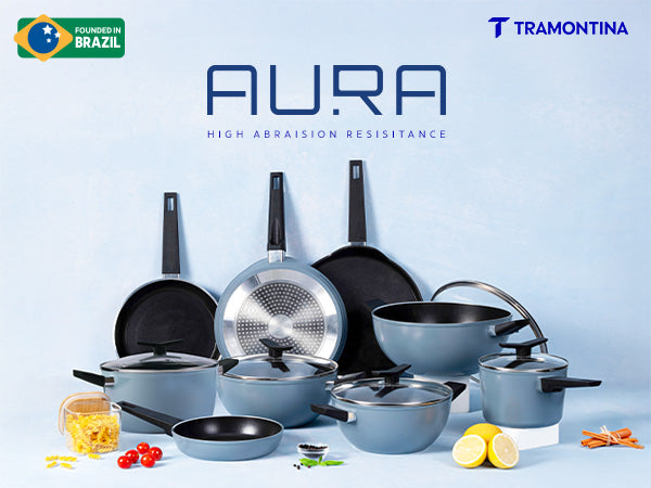 Tramontina Aura is a premium ceramic reinforced cookware range engineered for healthier, low-oil cooking. Built with cold-forged aluminium, the range delivers quick and even heat distribution for consistent results. The ceramic non-stick surface ensures smooth food release and easy cleaning, making it perfect for everyday Indian cooking styles like frying, sautéing, simmering, tadka and dosa preparation.