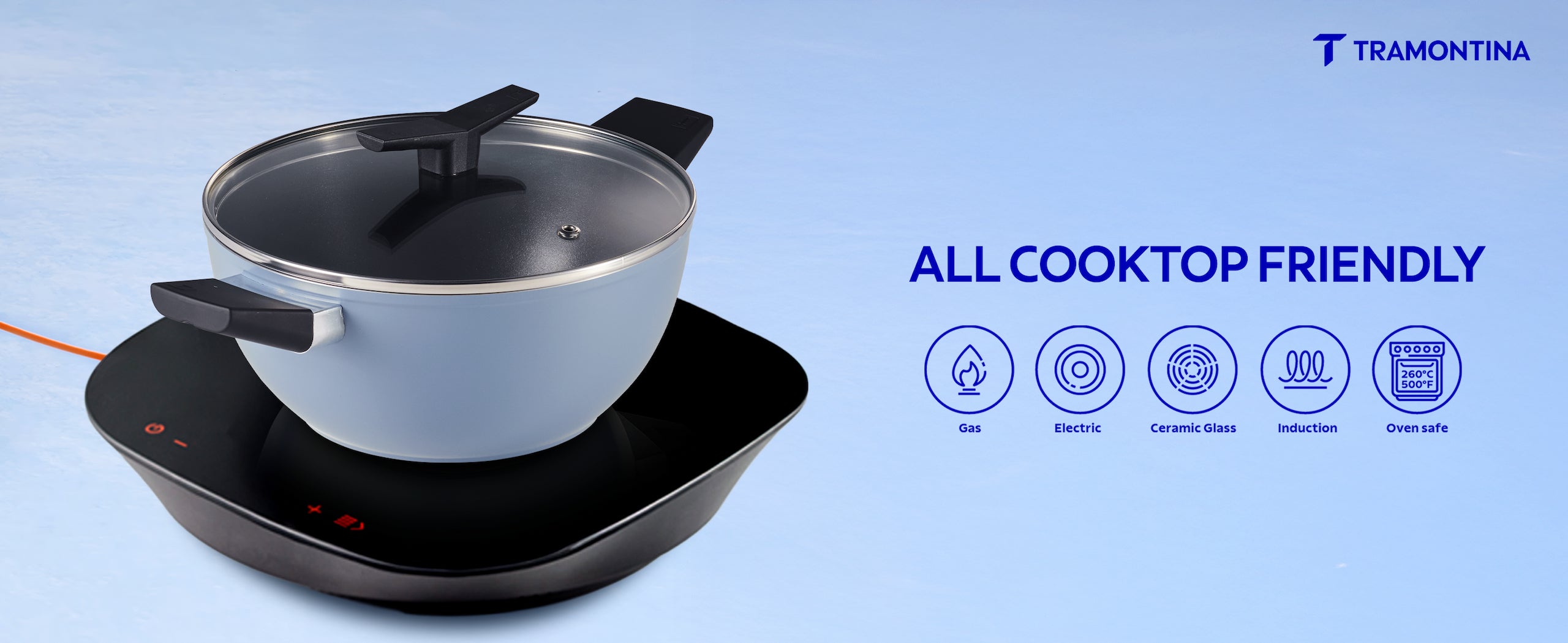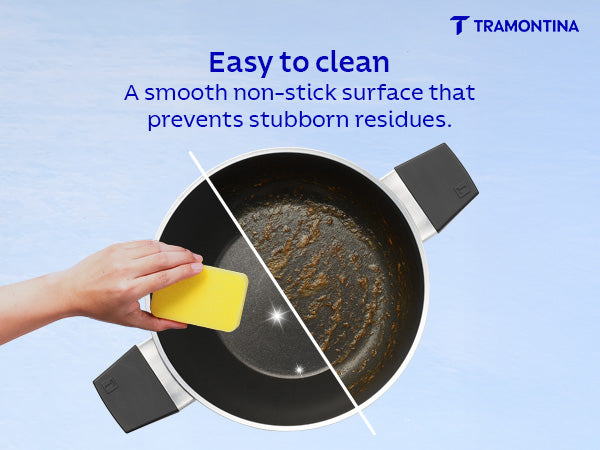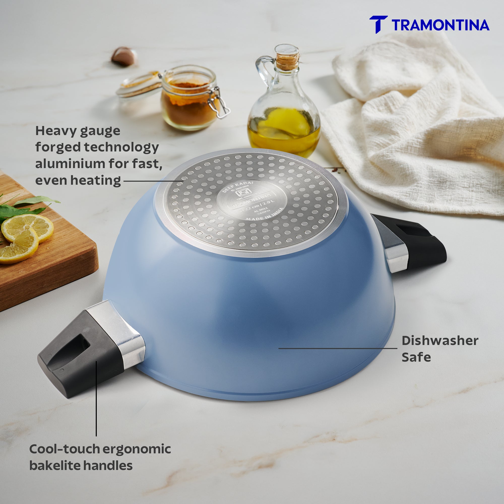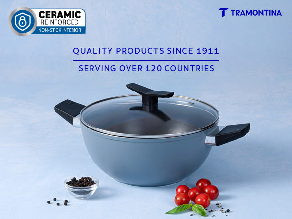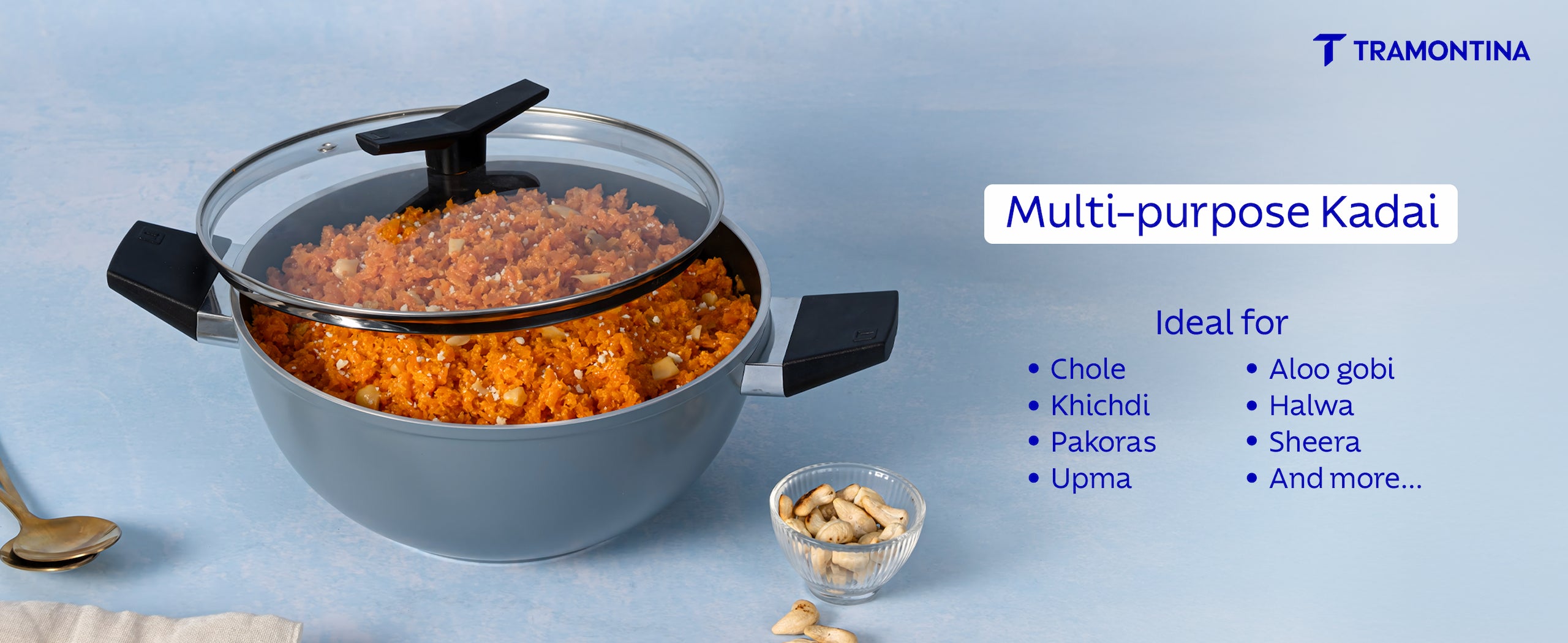 Tramontina Aura is a premium ceramic reinforced cookware range engineered for healthier, low-oil cooking. Built with cold-forged aluminium, the range delivers quick and even heat distribution for consistent results. The ceramic non-stick surface ensures smooth food release and easy cleaning, making it perfect for everyday Indian cooking styles like frying, sautéing, simmering, tadka and dosa preparation.