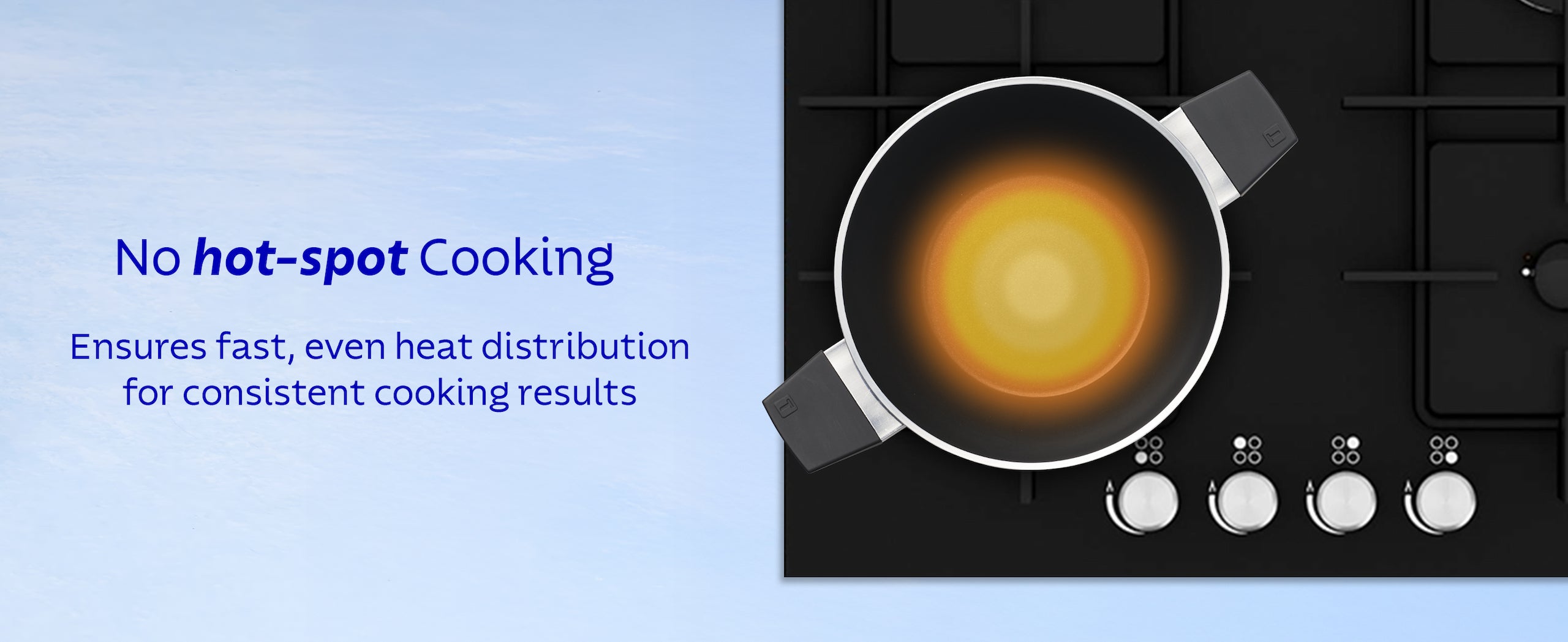 Available in multiple sizes and sets—including fry pans, kadais, tawas, saucepans and casseroles—the Aura range features ergonomic stay-cool Bakelite handles, glass lids with steam vents and compatibility with gas, induction and all major cooktops. Aura brings durability, elegance and reliability to every kitchen.