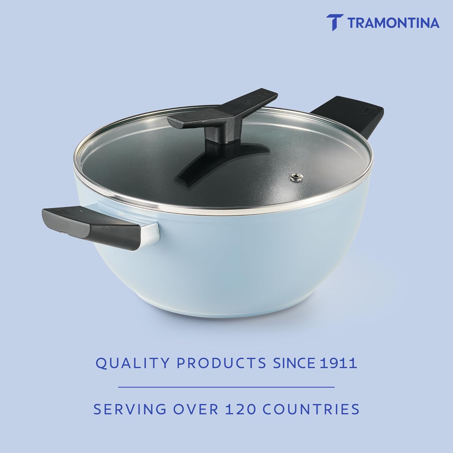 Tramontina Aura is a premium ceramic reinforced cookware range engineered for healthier, low-oil cooking. Built with cold-forged aluminium, the range delivers quick and even heat distribution for consistent results. The ceramic non-stick surface ensures smooth food release and easy cleaning, making it perfect for everyday Indian cooking styles like frying, sautéing, simmering, tadka and dosa preparation.