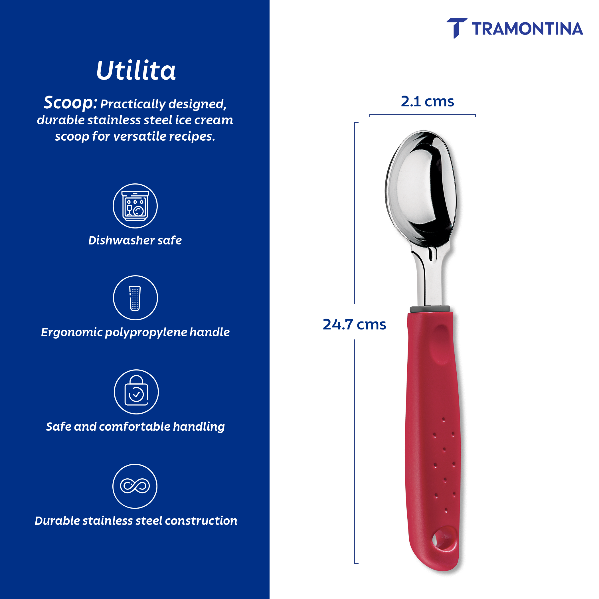 Practicality can be present at all times of your day, especially at mealtimes. And enjoying your favorite ice cream just got even easier with Tramontina's Utilitá Ice Cream Scoop with Stainless Steel Blade and Red Polypropylene Handle. It is made with a steel blade and polypropylene handle, features that make it resistant, durable and perfect for everyday use. It is also very easy to clean and is dishwasher safe, making your kitchen tasks much easier!