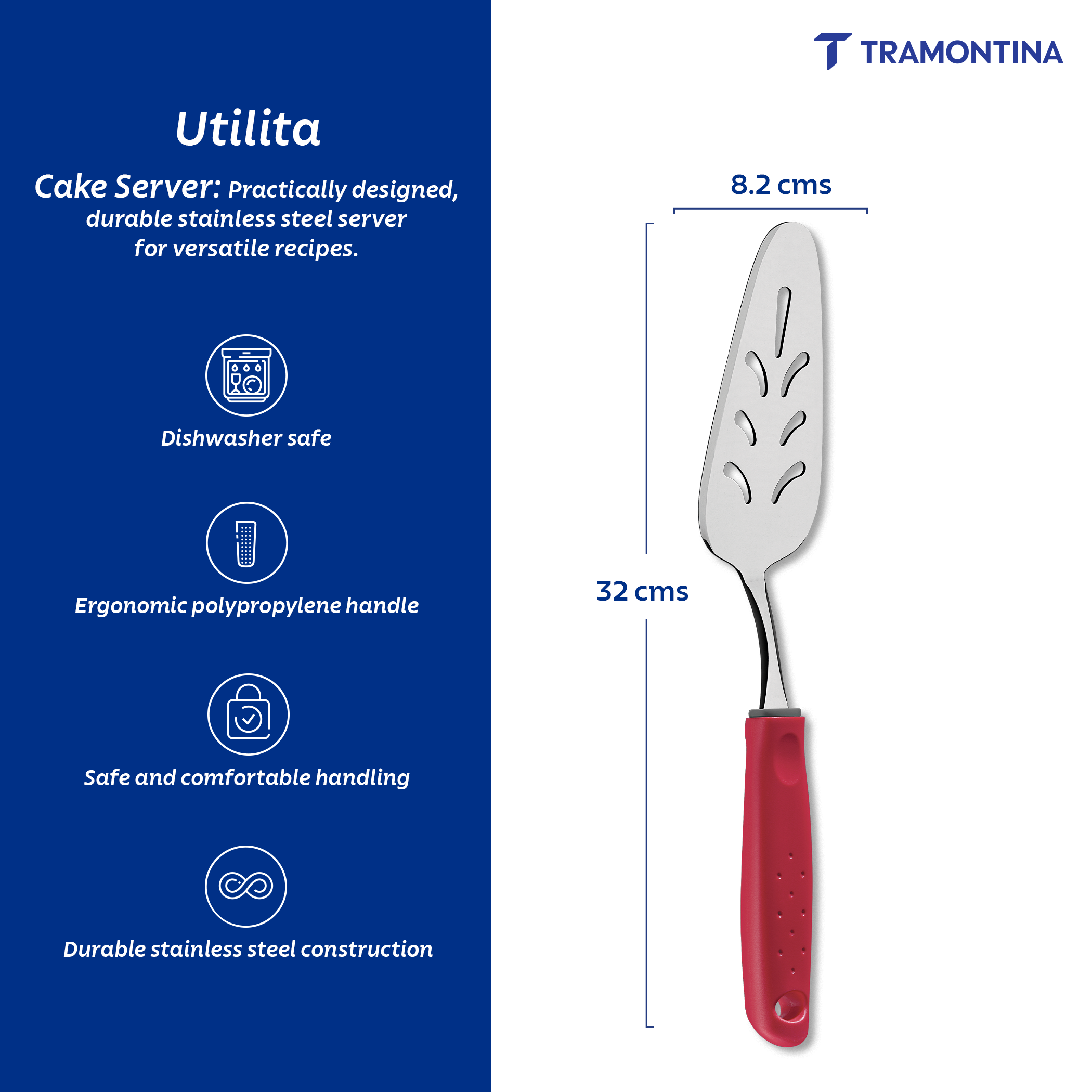 Sunday afternoons will never be the same again after you start using Tramontina's Utilità stainless steel cake spatula with red polypropylene handle, from the Utilità line, to serve that delicious cake to your family. Practicality is guaranteed by the perfect stainless steel blade, and the red polypropylene handle offers a modern and cozy design at the same time. Let the smell of cake fill your home and make your family much happier!