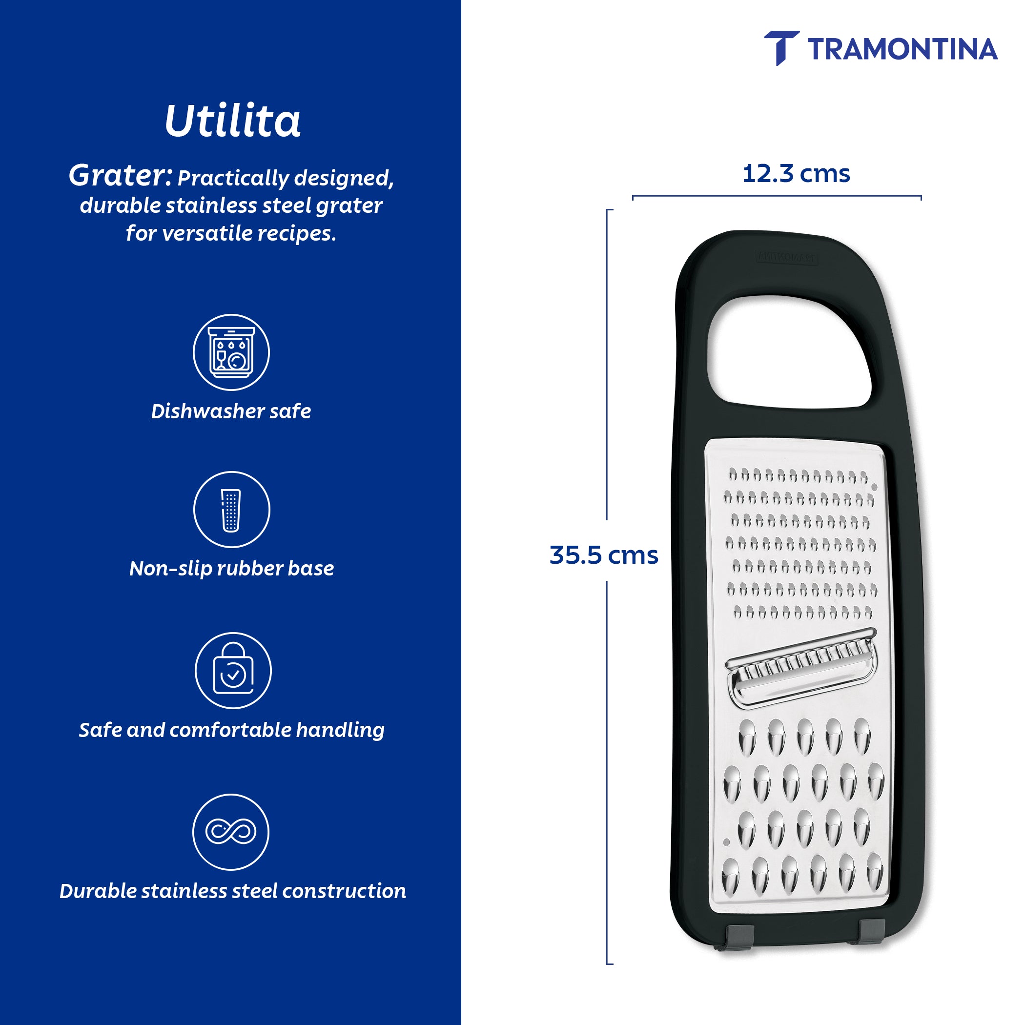 An essential utensil in any kitchen, the Tramontina Utilità stainless steel grater with polypropylene handle and non-slip rubber base in black is practical and matches any environment. Made with a stainless steel blade, polypropylene handle and protection, and non-slip rubber base, this product from the Utilità line makes all the difference in your kitchen.