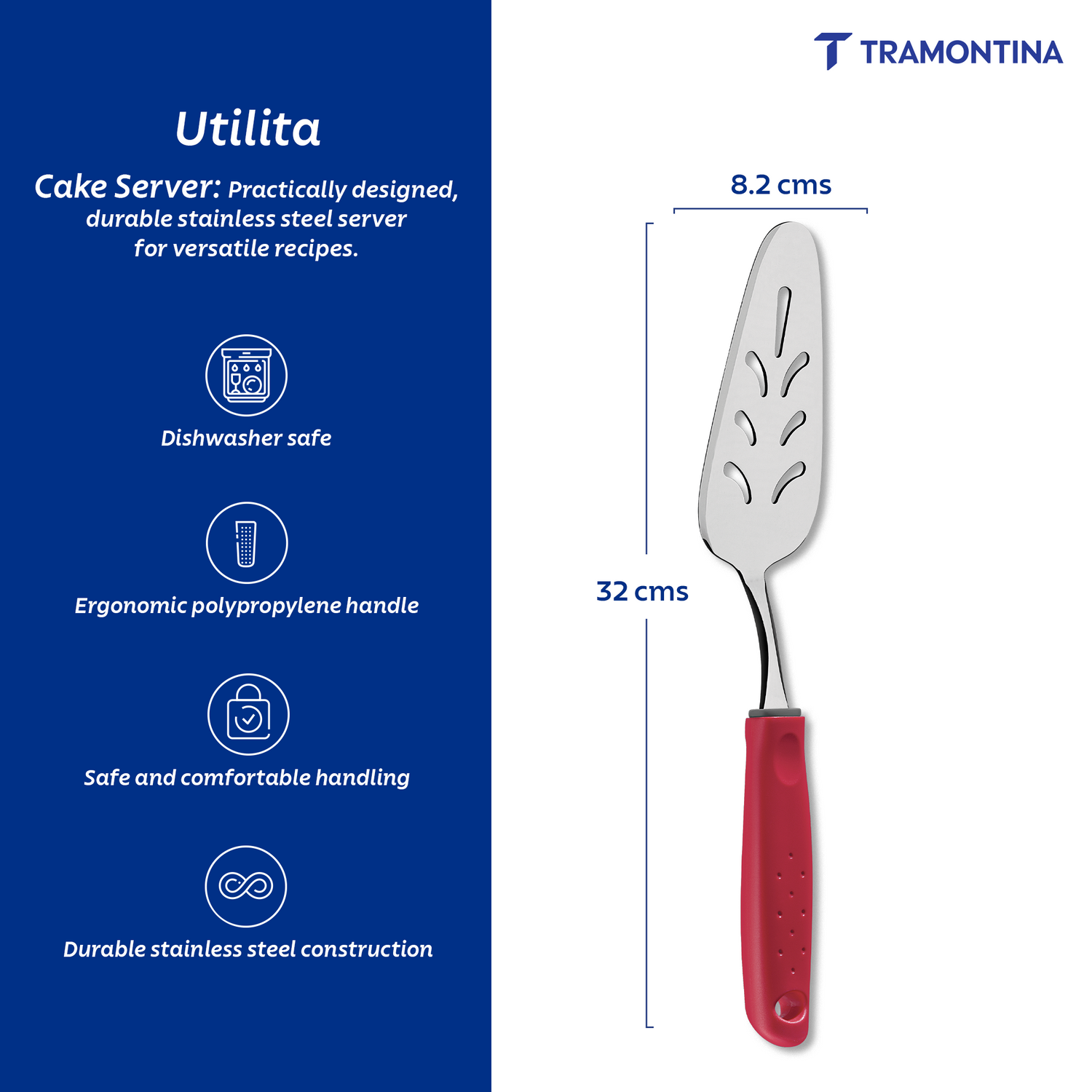 Sunday afternoons will never be the same again after you start using Tramontina's Utilità stainless steel cake spatula with red polypropylene handle, from the Utilità line, to serve that delicious cake to your family. Practicality is guaranteed by the perfect stainless steel blade, and the red polypropylene handle offers a modern and cozy design at the same time. Let the smell of cake fill your home and make your family much happier!