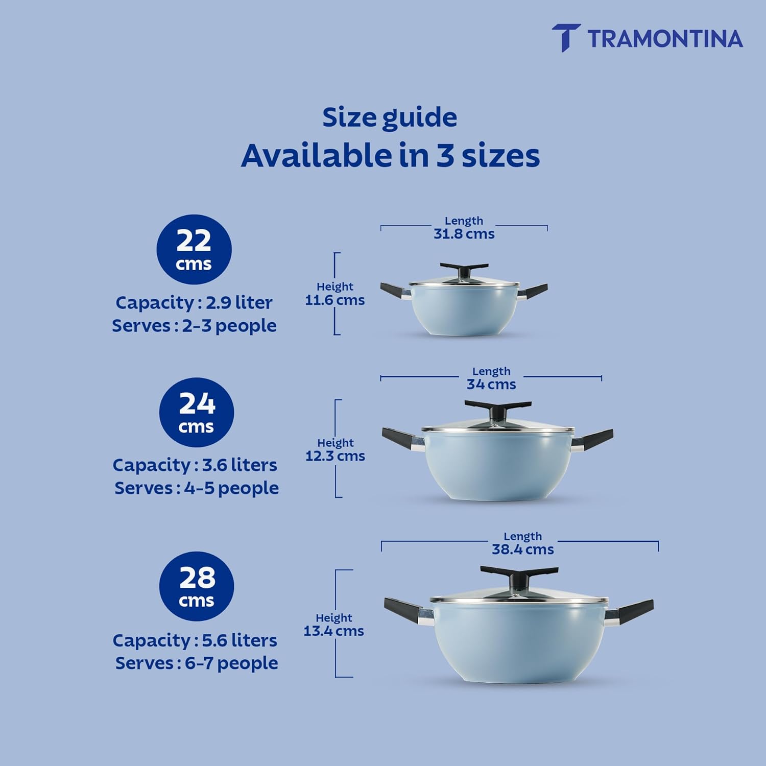 Tramontina Aura is a premium ceramic reinforced cookware range engineered for healthier, low-oil cooking. Built with cold-forged aluminium, the range delivers quick and even heat distribution for consistent results. The ceramic non-stick surface ensures smooth food release and easy cleaning, making it perfect for everyday Indian cooking styles like frying, sautéing, simmering, tadka and dosa preparation.