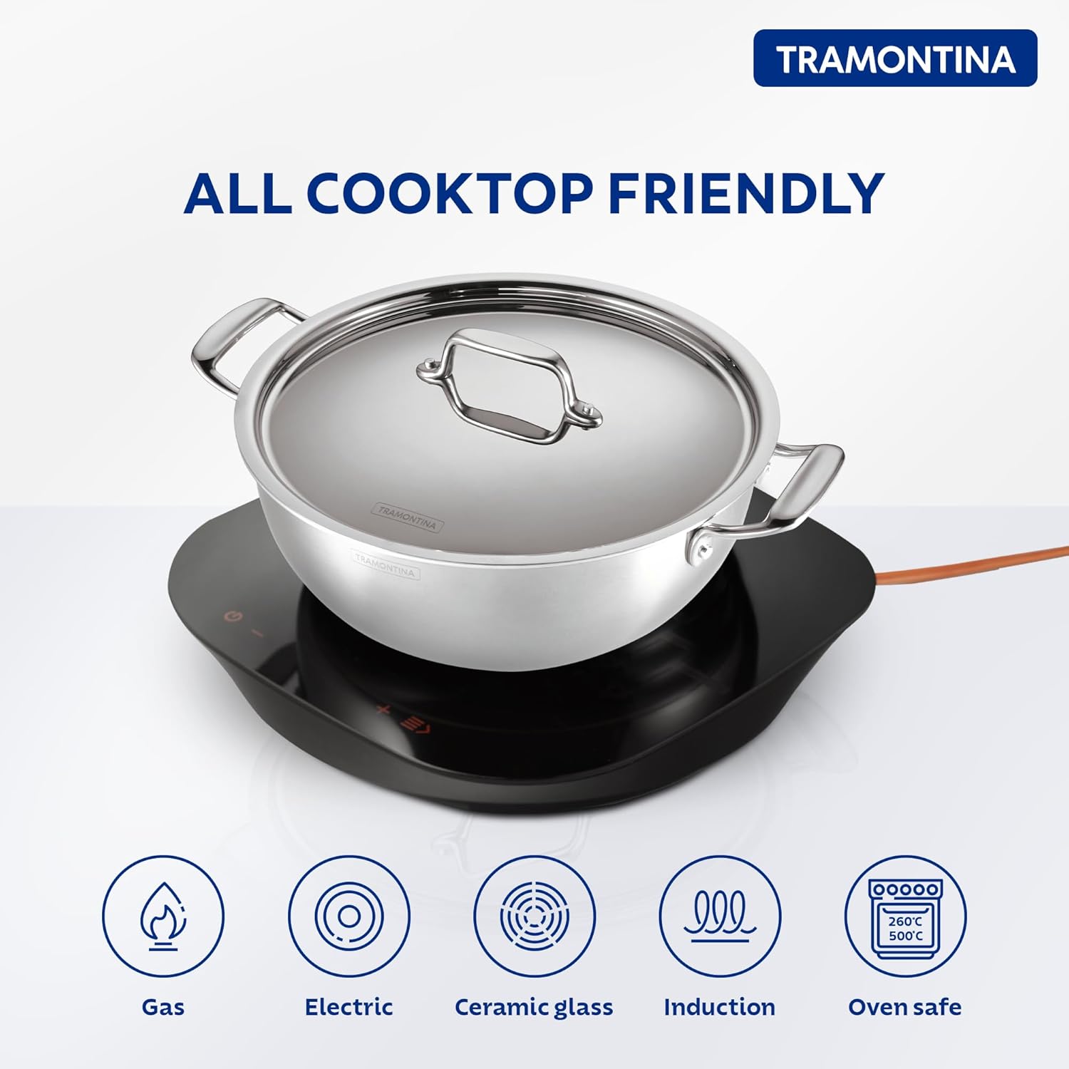 The circular bottom enables easy tossing and stirring of your veggies, a process that aids in monitoring the texture of the food. The lid on the kadai retains and enhances the flavour. Our non-stick ceramic kadai ensures equal distribution of heat and works as a secure base for frying and deep-frying. Embrace the art of cooking in the Tramontina tri-ply ceramic kadai.