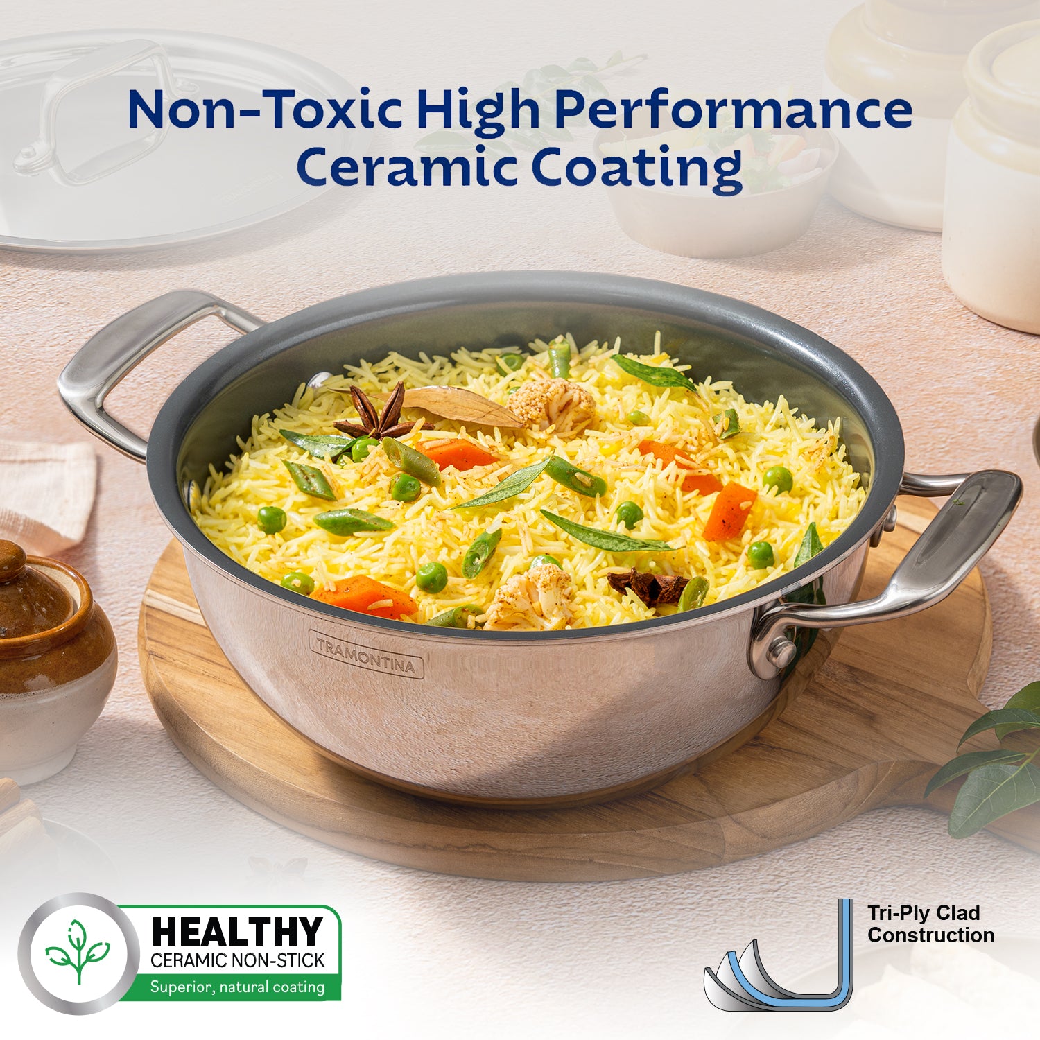 The circular bottom enables easy tossing and stirring of your veggies, a process that aids in monitoring the texture of the food. The lid on the kadai retains and enhances the flavour. Our non-stick ceramic kadai ensures equal distribution of heat and works as a secure base for frying and deep-frying. Embrace the art of cooking in the Tramontina tri-ply ceramic kadai.