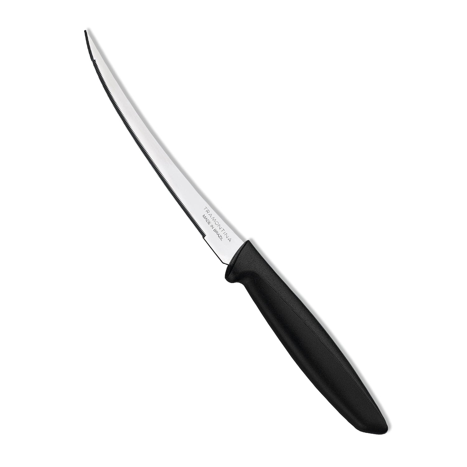 Make slicing tomatoes easier and more precise with the Tramontina Plenus 5-Inch Tomato Knife, designed specifically to handle delicate, soft-skinned fruits and vegetables. The micro-serrated stainless steel blade cuts cleanly through tomato skin without squashing the juicy interior, offering professional-quality results every time. Crafted from high-quality, heat-treated stainless steel, the blade retains its sharpness longer, ensuring reliable performance with each use. The black polypropylene handle is lightweight, ergonomic, and built for both comfort and durabilityperfect for everyday kitchen prep. When the slicing is done, cleanup is effortlessthis knife is dishwasher safe, helping you spend less time cleaning and more time enjoying your meals. Part of the trusted Tramontina Plenus Line, this tomato knife combines function, precision, and convenienceand its backed by a 90-day warranty for manufacturing defects. Upgrade your kitchen tools with the Tramontina Plenus 5-Inch Tomato Knife and enjoy easier, cleaner slicing every day.