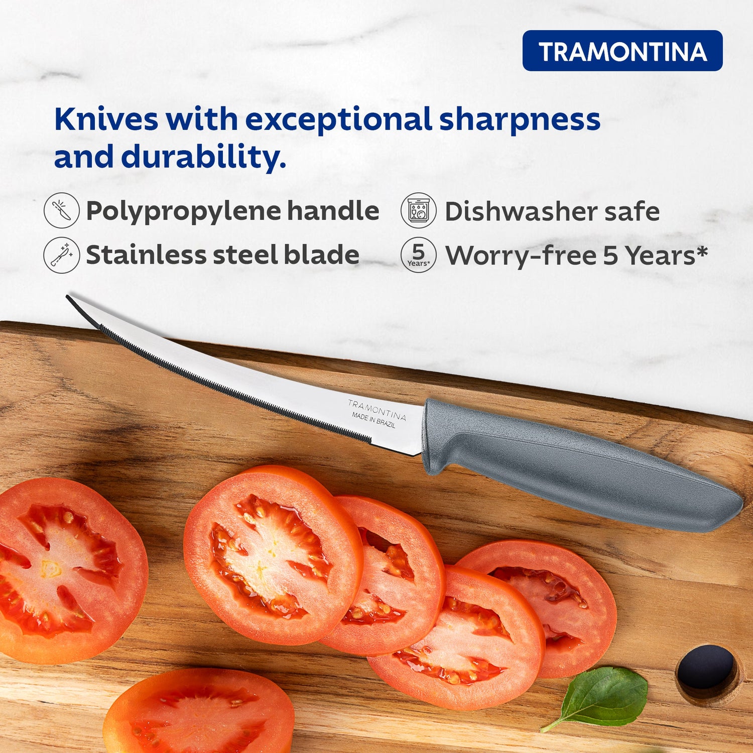 Achieve perfect tomato slices every time with the Tramontina Plenus 5-Inch Tomato Knifea must-have tool for soft-skinned fruits and vegetables. Its micro-serrated stainless steel blade is specially designed to slice through delicate tomato skin without squashing the juicy inside, ensuring clean, effortless cuts. Built with a heat-treated stainless steel blade, this knife stays sharper longer, delivering dependable performance with every use. The gray polypropylene handle is both strong and ergonomic, giving you a comfortable and stable grip while prepping meals. Dishwasher-safe and easy to maintain, this knife is part of the Tramontina Plenus Line, known for combining practicality, durability, and style. Whether you're preparing salads, sandwiches, or garnishes, this 5-inch tomato knife brings precision and ease to your kitchen tasks. Backed by a 90-day warranty for manufacturing defects, its a smart choice for everyday use.