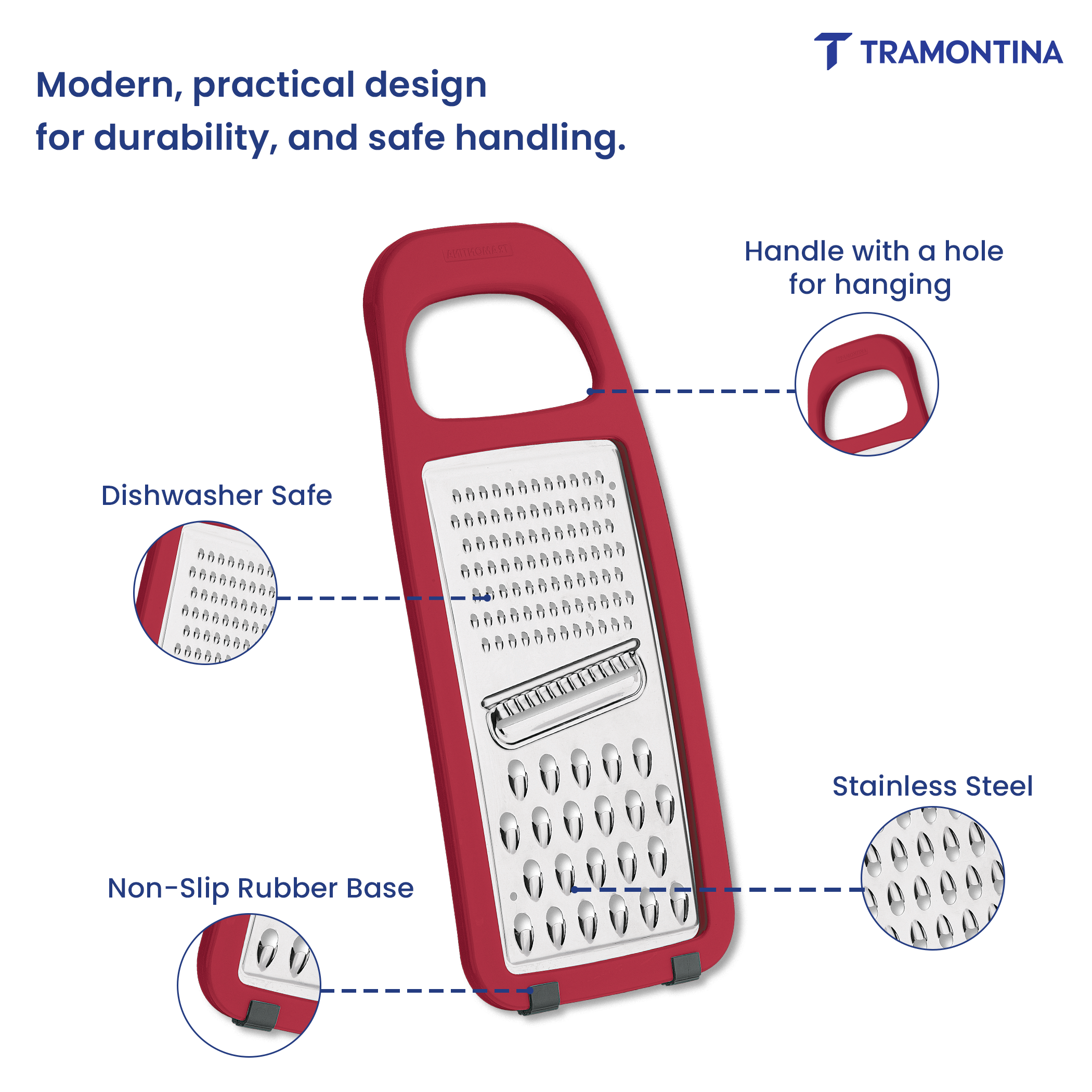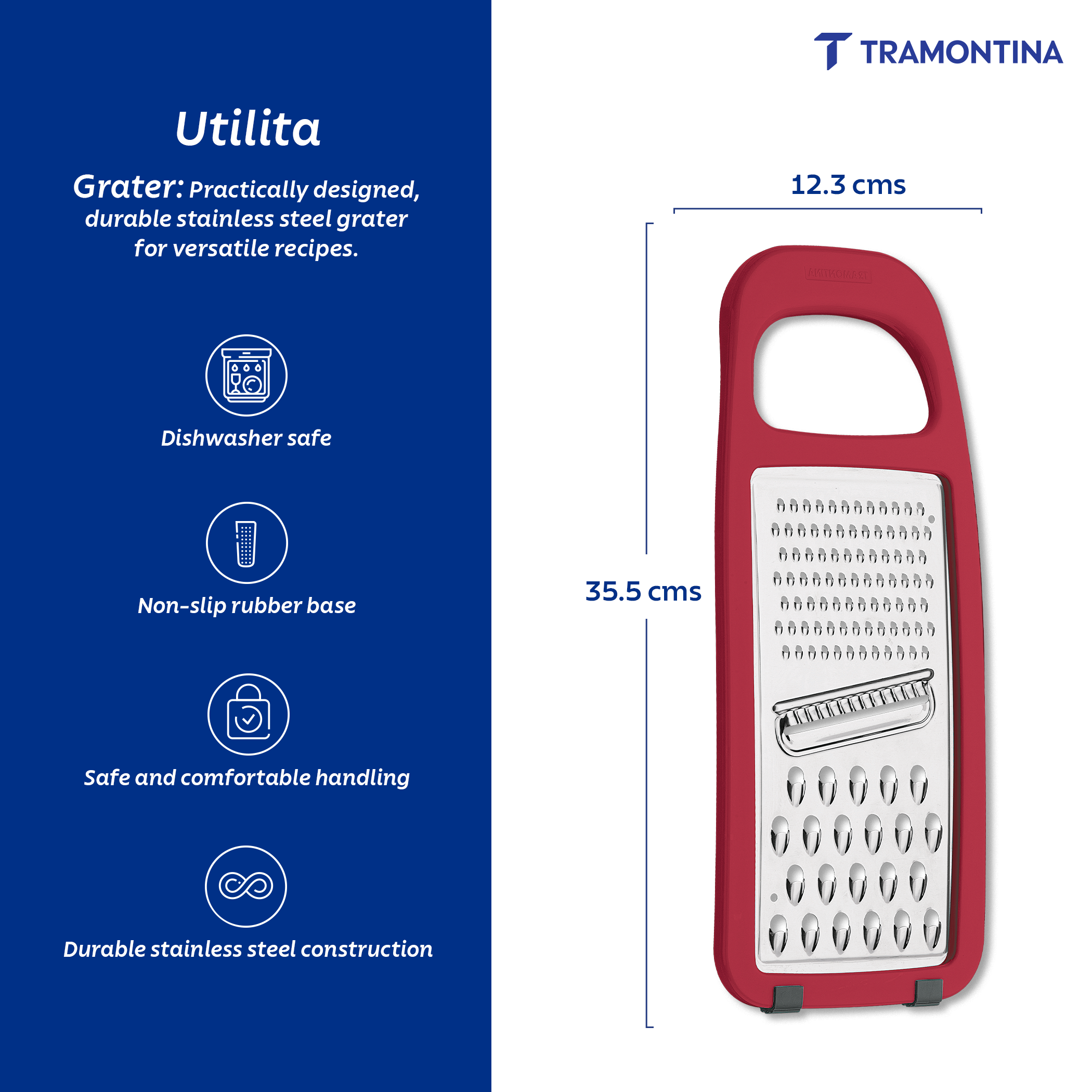 Make different types of preparations with Tramontina's Utilità stainless steel and ABS grater with red rubber base. It will offer more practicality for your daily routine in the kitchen. Designed by the Utilità line, which has a wide variety of utensils to make the kitchen more complete and your routine even easier. With a distinctive, modern design and several color options for you to choose the one that best matches your personality. The grater is made with a stainless steel blade, ensuring its durability and maintaining its original features for longer. It has an ABS handle with a non-slip rubber base, which promotes comfortable and safe handling.
