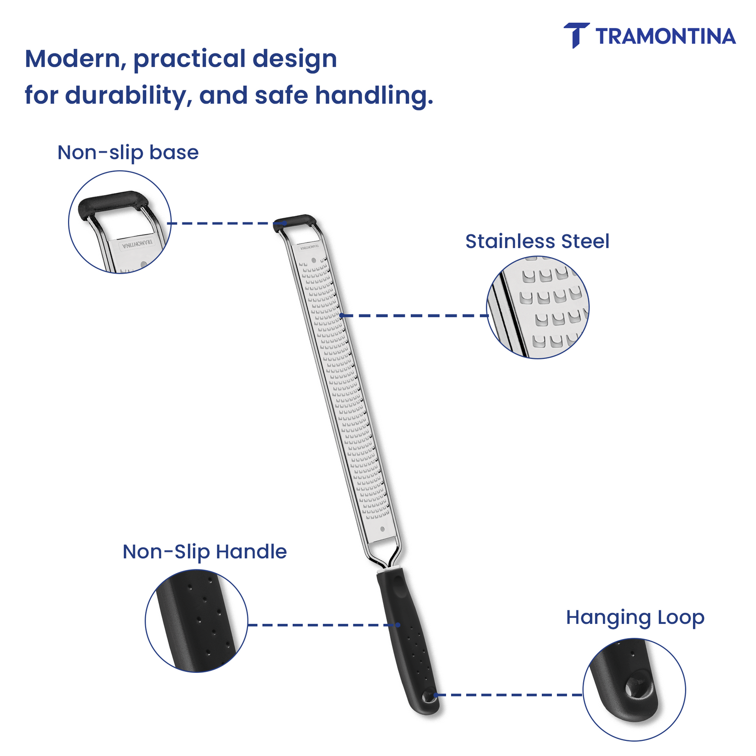 Diversify the way you prepare ingredients with Tramontina's Utilità stainless steel and ABS grater with black rubber base. This piece, from the Utilità line, offers practicality and different cutting options, so you can innovate and create new types of preparations. The grater is made with a stainless steel blade, ensuring its durability and maintaining its original characteristics for longer. It has an ABS handle with a non-slip rubber base, which promotes comfortable and safe handling.